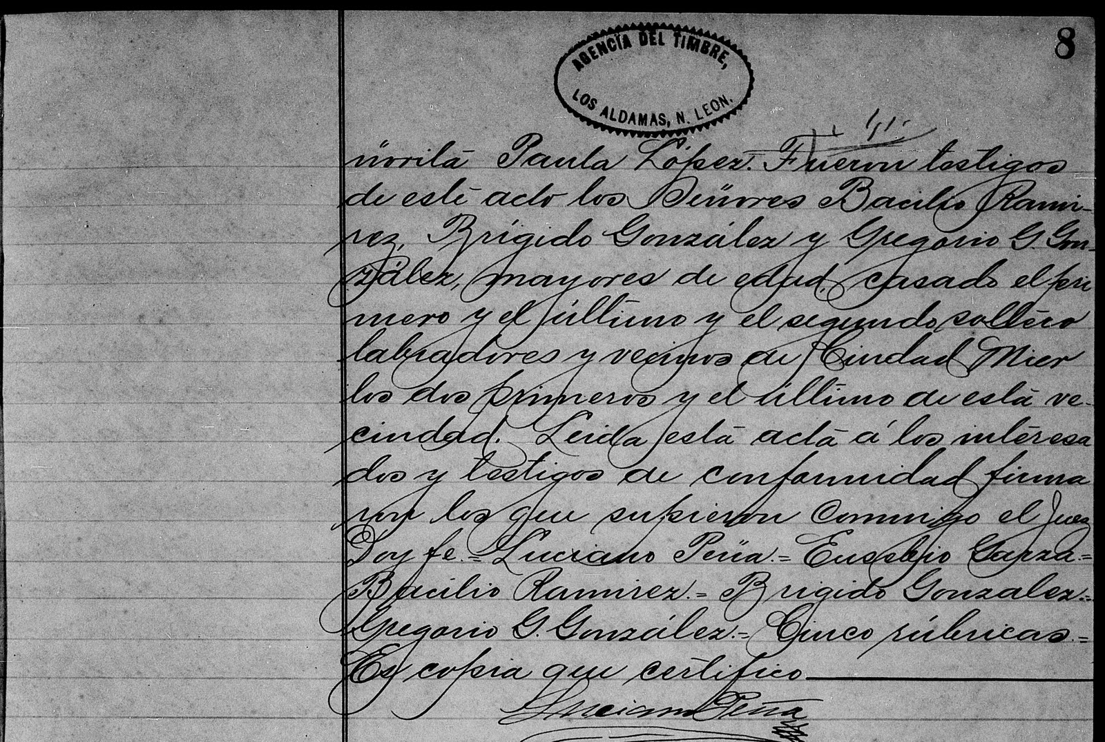 Acta numero 9 nueve. = En la villa de Los Aldamas a los 20 veinte dias del mes de Marzo de 1907 mil novecientos siete a las 8 ocho de la noche ante mi Luciano Pena Juez del Estado Civil de esta Municipalidad hallandome en el despacho de esta Oficina, presentes el Senor Eucebio Garza y la Senorita Paula Lopez, ambos celibes, el primero de 22 veintidos anos de edad hijo legitimo de Don Martin Garza y Dona Ruperta Lopez y la segunda de 18 diesiocho anos de edad hija lejitima de Don Jorge Lopez y Dona Luz Garza, todos vecinos de Ciudad Mier, Estado de Tamaulipas, con residencia en la Congregacion de El Arcabus; de profesion el pretenso y el padre labradores. Ambos contrayentes dijeron que habiendose presentado en objeto de contraer matrimonio el dia 3 tres de Diciembre del ano proximo pasado, en cuyo acto tambien estubo presente el padre de la pretensa, dando en consentimiento, asi como lo hace ahora para que su hija contraiga el matrimonioconsertado por ser menor de edad, y por otra parte haciendo sido hechas las publicaciones en la forma legal, sin que se haya presentado inpedimiento alguno segun aparece de las constancias prespectivas, piden al Senor Juez autorice Consentada union. Ynterogados los contrayentes en los terminos de al ley hicieron la formal declaracion de ser su voluntad unirse en matrimonio, y entregarse mutuamente como marido y mujer, en esta virtud yo Luciano Pena Juez del Estado civil de esta villa, hice la siguiente declaracion: En nombre de la sociedad declaro unidos en perfecto, legitimo e indisaluble matrimonioal Senor Eusebio Garza y a la Senorita Paula Lopez. Fueron testigos de este acto los Senores Bacilio Ramirez, Brigido Gonzalez y Gregorio G. Gonzalez, mayores de edad, casado el primero y el ultimo y el segundo soltero labradores y vecinos de Ciudad Mier los dos primeros y el ultimo de esta vecindad. Leida esta acta a los interesados y testigos de conformidad firmaron los que supreson Conmigo el Juez Doy fe. = Luciano Pena. = Eusebio Garza. = Bacilio Ramirez. = Brigido Gonzalez. = Gregorio G. Gonzalez. = Cinco surlericas. = Es copia que certifico