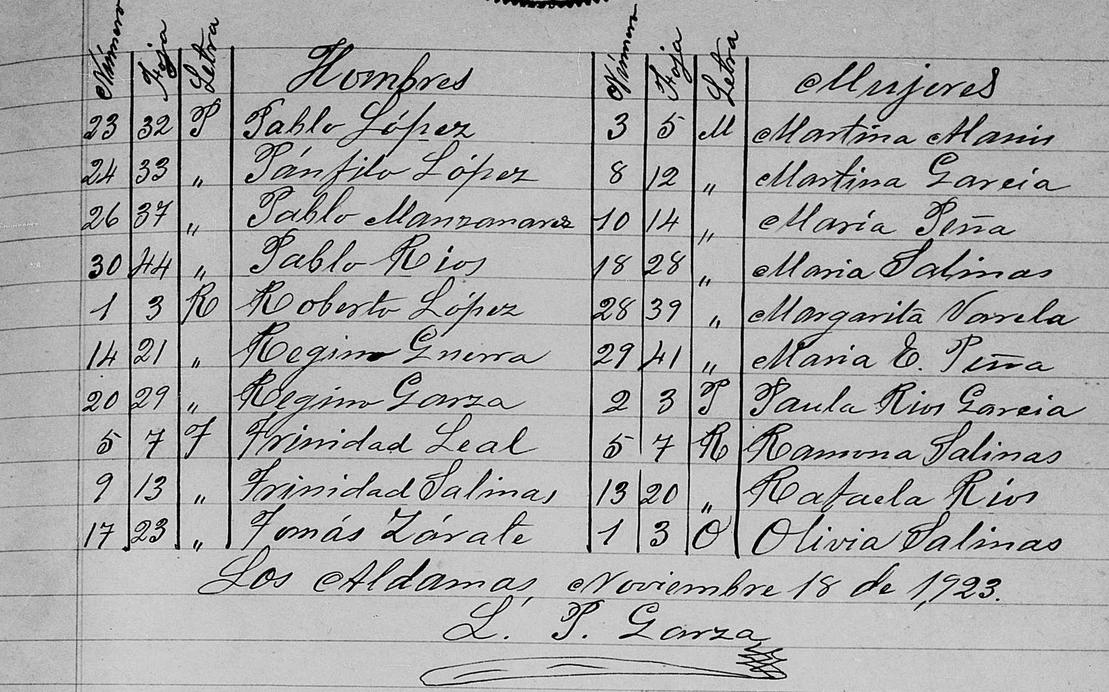 The following images are of the index of the marriages that took place in Los Aldamas, Nuevo Leon, Mexico in 1923. Following the images you can find a transcript of them for easier searching and also easier browsing.