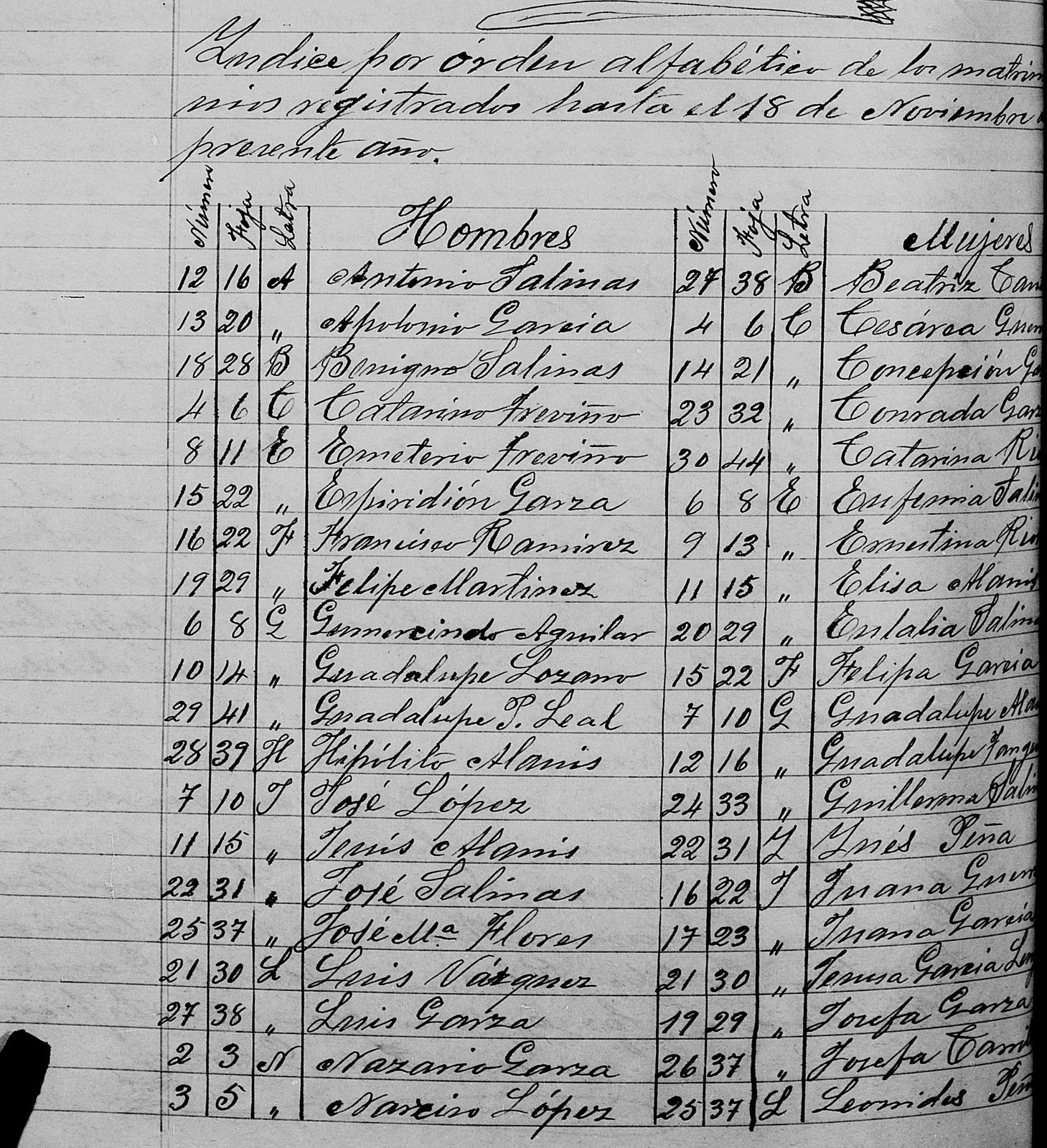 The following images are of the index of the marriages that took place in Los Aldamas, Nuevo Leon, Mexico in 1923. Following the images you can find a transcript of them for easier searching and also easier browsing.
