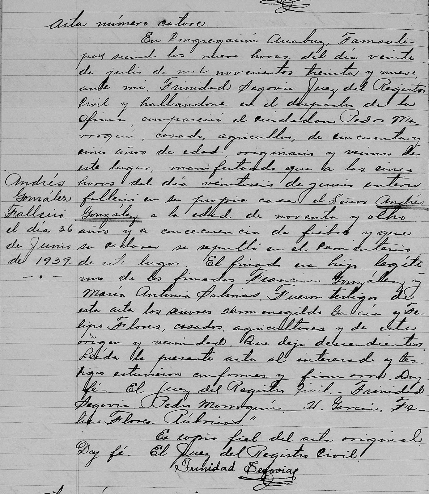 En Congregacion Arcabuz, Tamaulipas siendo las nueve horas del dia veinte de julio de mil novecientos treinta y nueve, ante mi, Trinidad Segovia Juez del Registro Civil y hallandome en el despacho de la Oficina comparecio el ciudadano Pedro Marroquin, casado, agricultor, de cincuenta y cinco anos de edad, originario y vecino de este lugar, manifestando que a las cinco horas del dia veintiseis de junio anterior fallecio en su propia casa el Senor Andres Gonzalez a la edad de noventa y ocho anos y a concecuencia de fiebre y que su cadaver se sepulto en el cemeterio de este lugar. El finado era hijo legitimo de los finados Francisco Gonzalez y Maria Antonia Salinas. Fueron testigos de esta acta los senores hermenegildo Garcia y Felipe Flores, casados, agricultores y de este origen y vecindad. Que deja descendientes. Leida la presente acta al interesado y testigos estuvieron conformes y firmaron. Doy fe -. El Juez del Registro Civil. – Trinidad Segovia. Pedro Marroquin. – H. Garcia. Felipe Flores – Rubricas.”Es copia fiel del acta original.