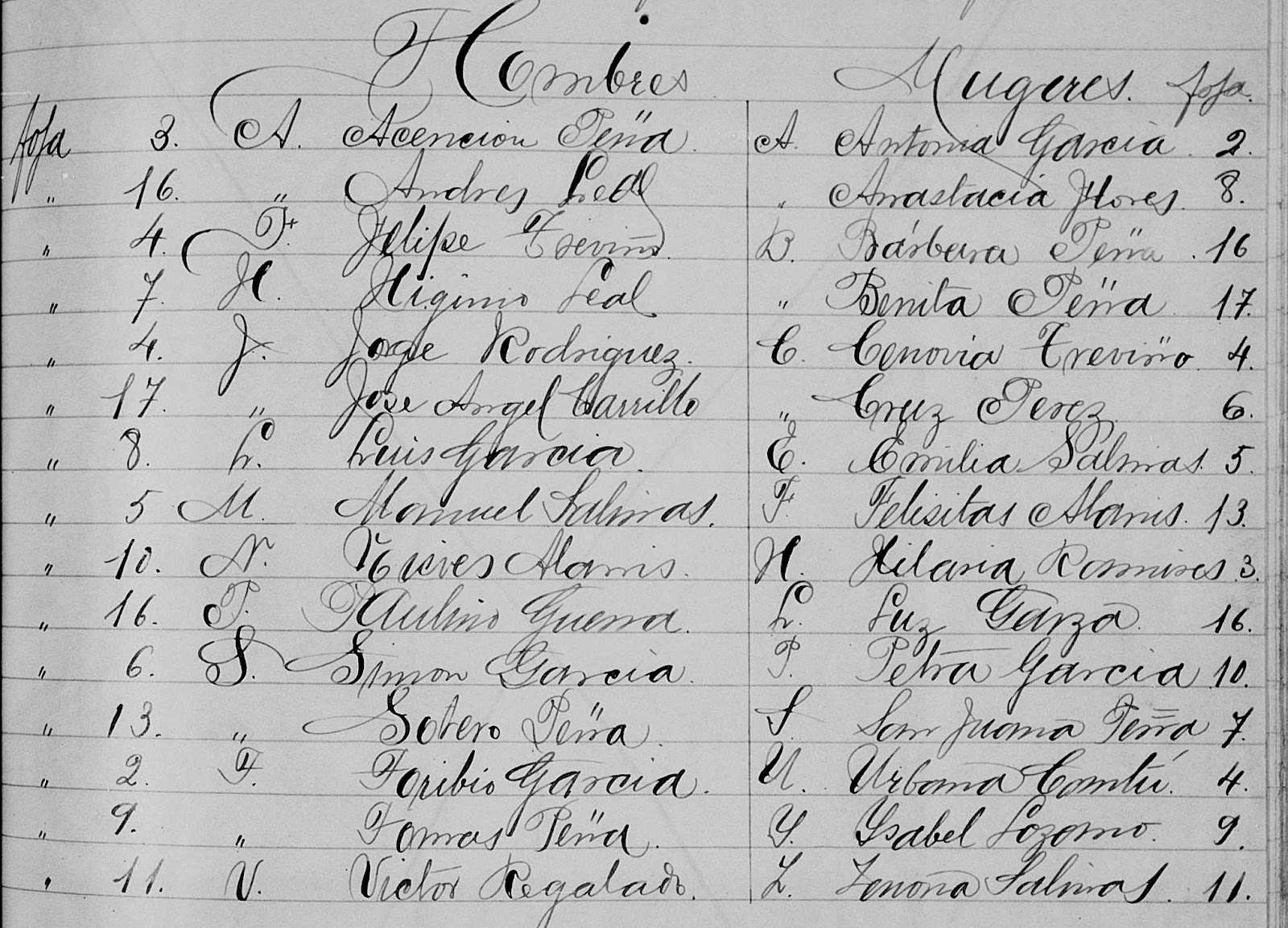 1893 Index of Marriages of Los Aldamas Nuevo Leon Mexico in lists by male and female and in alfabetical order.