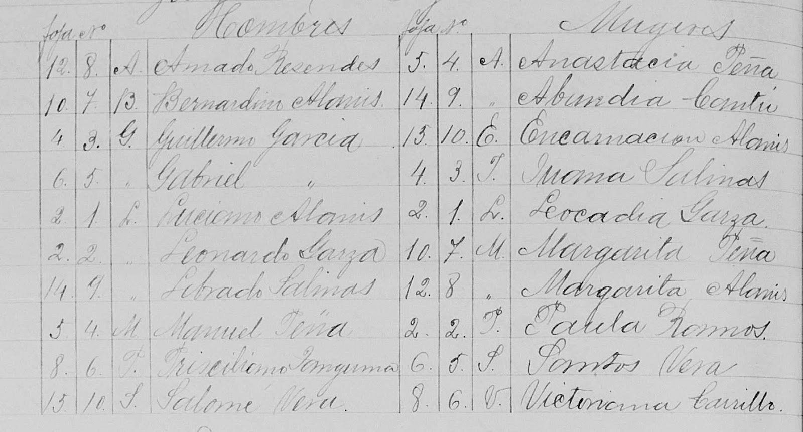 1892 Index of Marriages of Los Aldamas Nuevo Leon Mexico in lists by male and female and in alfabetical order.
