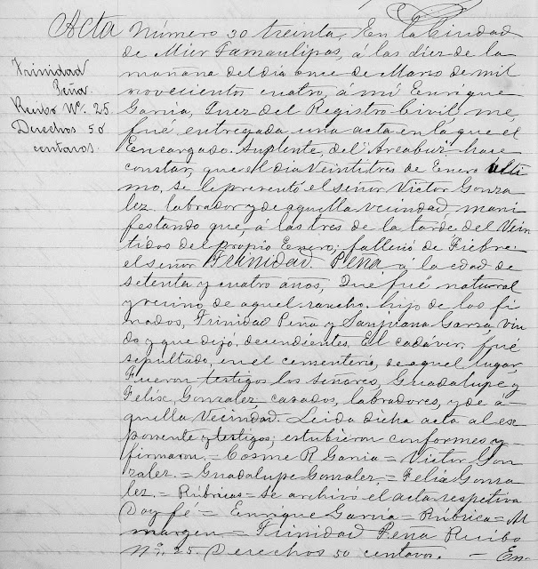 Acta numero 30 treinta, En la Ciudad de Mier Tamaulipas, a las diez de la manana del dia once de Marzo de mil novecientos cuatro, a mi Enrique Garcia, Juez del Registro Civil me fue entregada una acta en la que el Encargado. Suplente, del Arcabuz hase constar, que el dia veintitres de Enero alli mismo, se le presento el Senor Victor Garzalez, labrador y de aquella vecindad, manifestando que, a las tres de la tarde del veintidos del propio Enero fallecio de Fiebre el Senor Trinidad Pena a la edad de sesenta y cuatro anos, Que fue natural y vecino de aquel rancho. hijo de los finados, Trinidad Pena y Sanjuana Garza, viudo y que dejo. decendientes. El cadaver, fue sepultado, en el cemeterio, de aquel lugar, Fueron testigos los Senores, Guadalupe y Felix Gonzalez; casados, labradores, y de aquella vecindad. Leida dicha acta al exponente y testigos; estubieron conformes y firmaron. = Cosme R. Garcia = Vicot Gonzalez. = Guadalupe Gonzalez. = Felix Gonzalez. = Rubricas = Se archivo el acta respetiva Doy fe = Enrique Garcia = Rubrica = Al margen. = Trinidad Pena Recibo No 25. Derechos 50 centavos. = Enrique Garcia