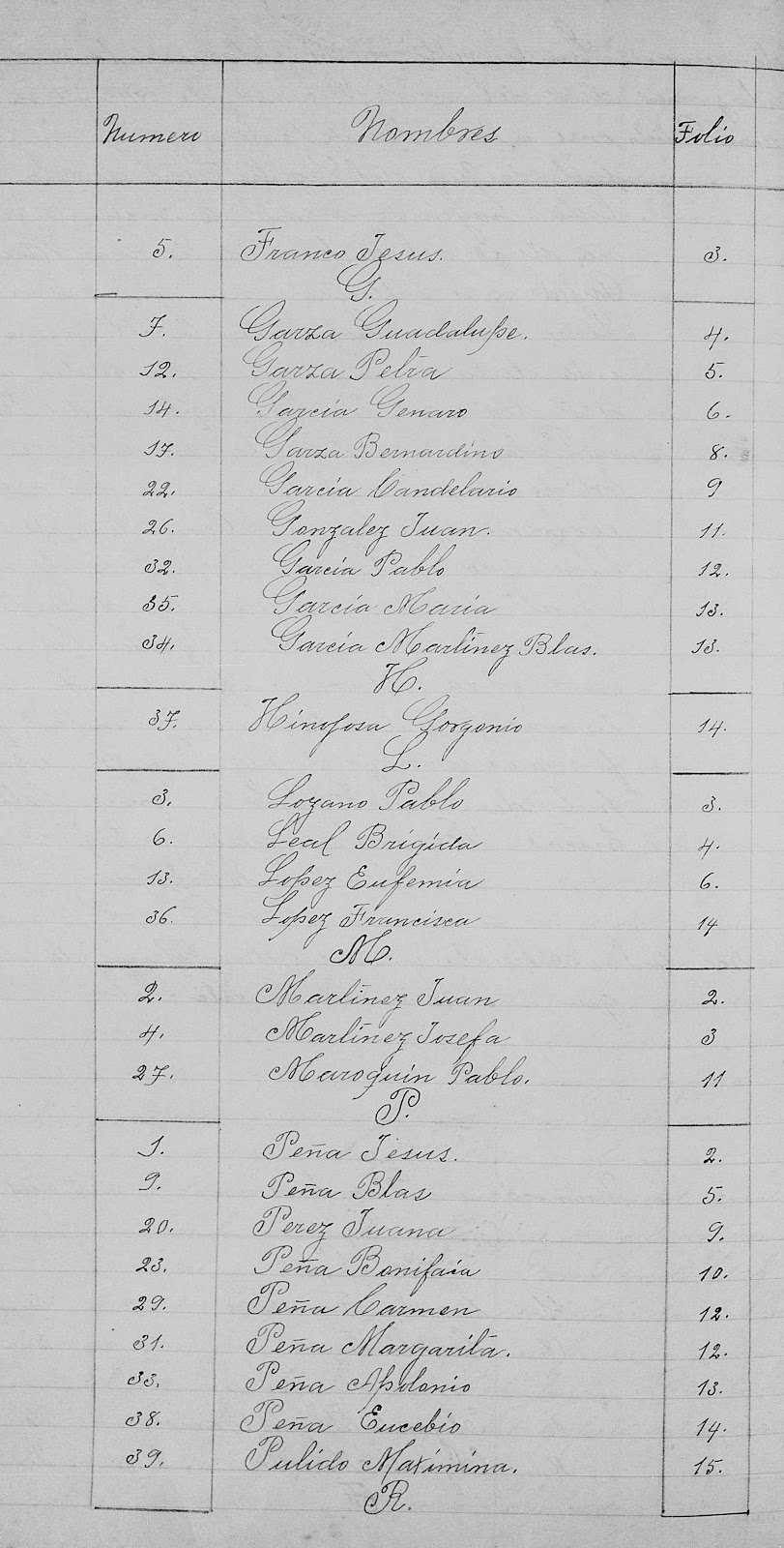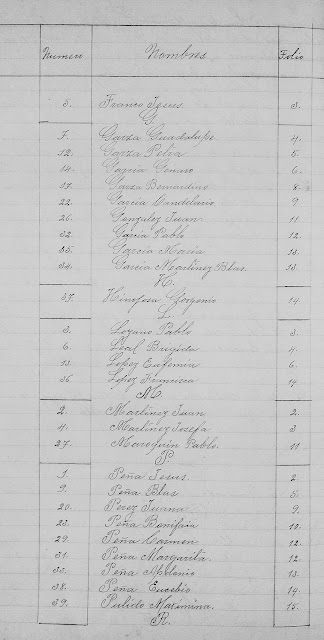 1911 Death Index of Los Aldamas Nuevo Leon Mexico in lists by male and female and in alfabetical order.