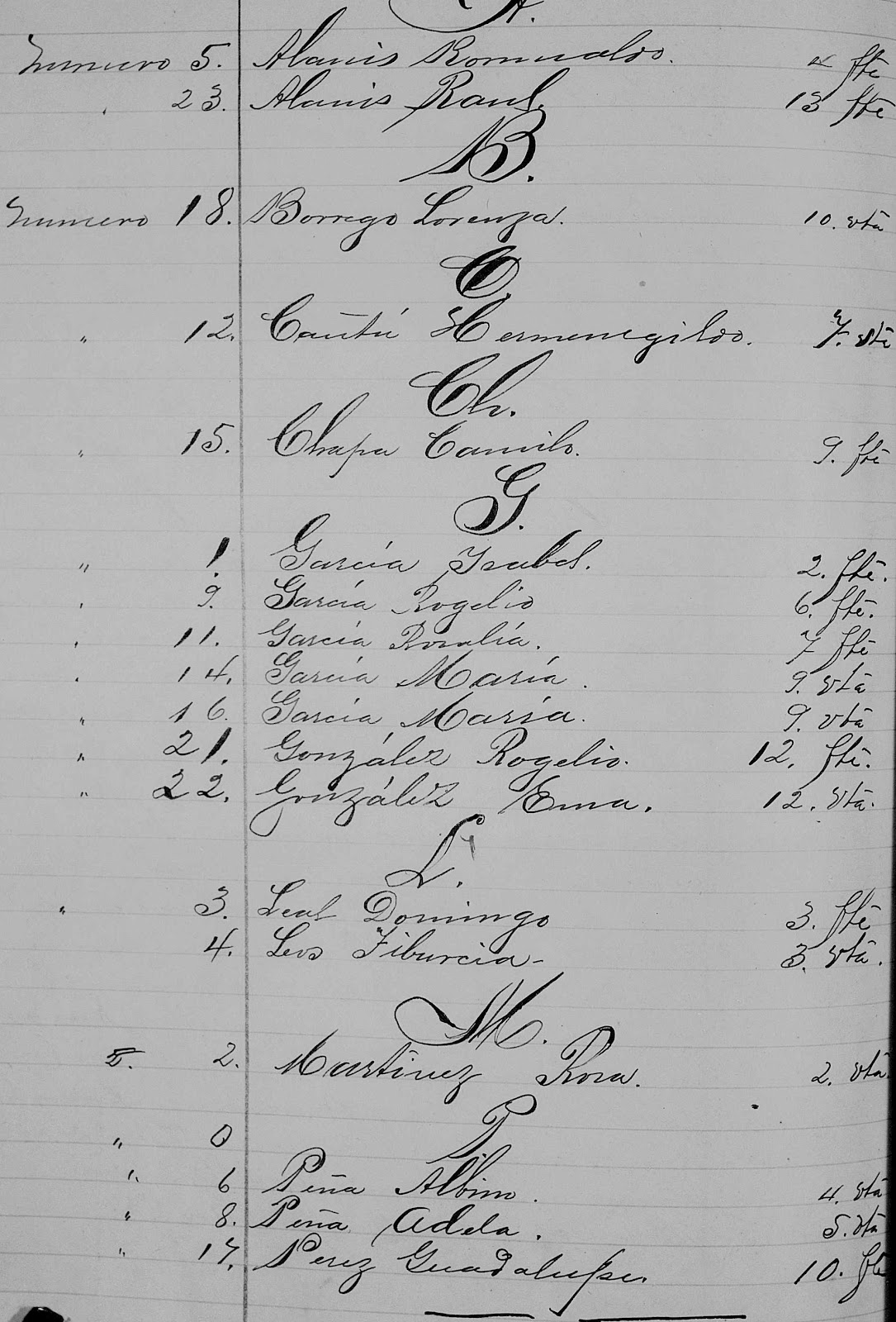 1920 Death Index of Los Aldamas Nuevo Leon Mexico in alfabetical order.