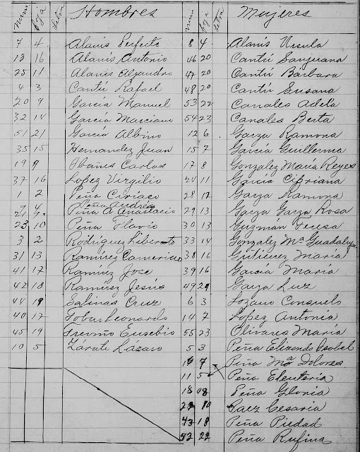 1930 Death Index of Los Aldamas Nuevo Leon, Mexico in lists by male and female and in alphabetical order.