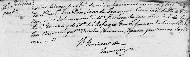 This is the baptism of my 3r great grandmother Maria Felicita Guerra Gonzalez through my paternal line. She was the daughter of Jose Juan Manuel Antonio Guerra de Guadiano and Maria del Refugio Gonzalez Guerra. She is the mother of my 2nd great grandmother Maria Nicolasa Guerra Guerra.
