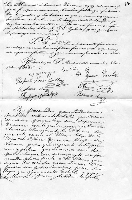 Los que abajo firmamos, vecinos del rancho de San Andrés del Arcabus, ante Usted, como mejor haya lugar y derecho, comparecemos diciendo; que teniendo que dar estado a nuestros hijos según manda nuestra madre la Iglesia, y siendo muy gravoso y perjudicial el que estos matrimonios se celebren en Los Aldamas, a donde por orden del Ilustrísimo Señor Obispo, se nos segrego para que formáramos parte de aquella Iglesia sin haberlo solicitado, solicitamos a Usted, se sirva contarnos como siempre en el numero de sus feligreses y proceda a la presentación y matrimonio de nuestros citados hijos, pues no es de nuestra voluntad, pertenecer a la Parroquia de Los Aldamas, por las causas que vamos a exponer: