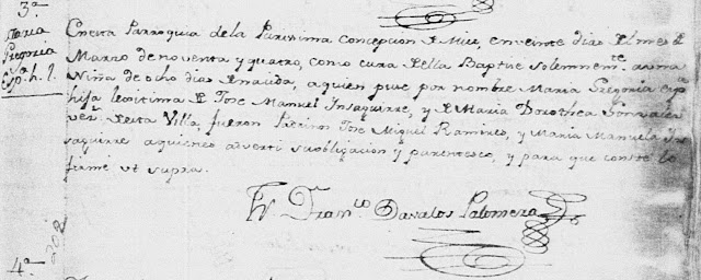 En esta Parroquia de la Purisima concepcion de Mier, en veinte dias del mes de Marzo de noventa y cuatro, como cura de ella Baptise Solemnemte. a una Ninoa de ocho dias de nacida, a quien puse por nombre Maria Gregoria espa. hija lexitima de Jose Manuel Ysaguirre, y de Maria Dorotea Gonzalez vesa. de esta Villa, fueron Padrinos Jose Miguel Ramirez, y Maria Manuela Ysaguirre a quienes adverti su obligacion y parentesco, y para que conste lo firme ut supra.