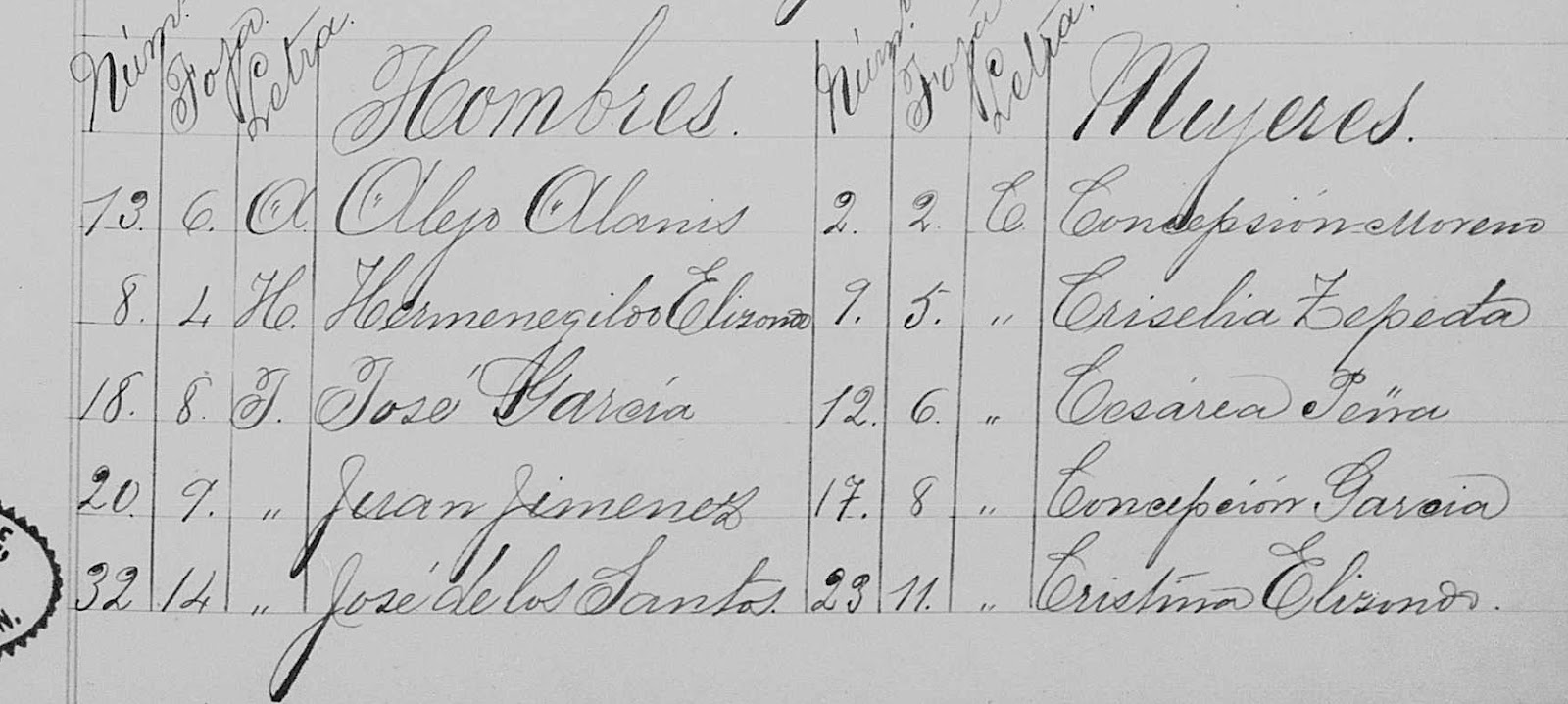 Num.   Foja     Letra    Hombres                      Num.   Foja     Letra    Mujeres