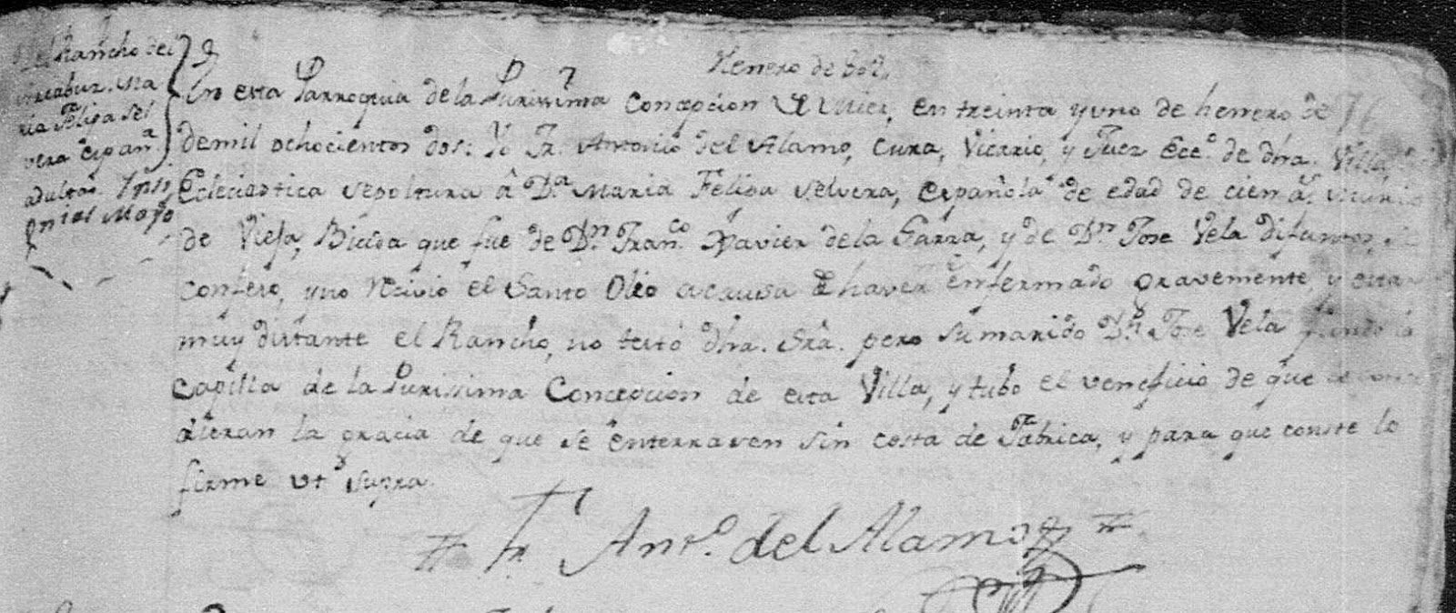 En esta Parroquia de la Purisima Concepcion de Mier, en treinta y uno de henero de demil ochocientos dos: Yo Fr. Antonio Del Alamo, Cura, Vicario, y Juez Eceo. de esta, Villa Ecleciastica sepoltura a Da. Maria Felipa Selvera, Espanola de edad de cien as. murio de Vieja, Biuda que fue de D.n Franco. Xavier de la Garza, y de Dn. Jose Vela Difuntos, se confeso, y no recivio el Santo Oleo a causa de haver enfermado gravemente, y era muy Distante el Rancho, no testo esta. Sra. pero su marido Dn. Jose Vela fundo la Ca[pilla de la Purisima Concepcion de esta Villa, y tubo el veneficio de que se condieran la gracia de que se enterraren sin costo de Fabrica, y para que conste lo firme et supra.