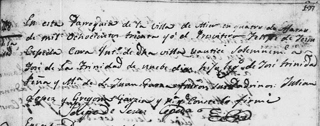 En esta Parroquia de la Villa de Mier en quatro de Marzo de mil Ochocientos treinta yo el Presvitero Felipe de Jesus Cepeda Cura Into. de Esta villa vautice Solemneme. a Jose de la Trinidad de nuebe dias, hijo lego. de Jose Trinidad Pena y Ma. de S. Juan Garza fueron sus Padrinos: Julian Lopez y Gregoria Garzia y pa. qe. Conste lo firme.
