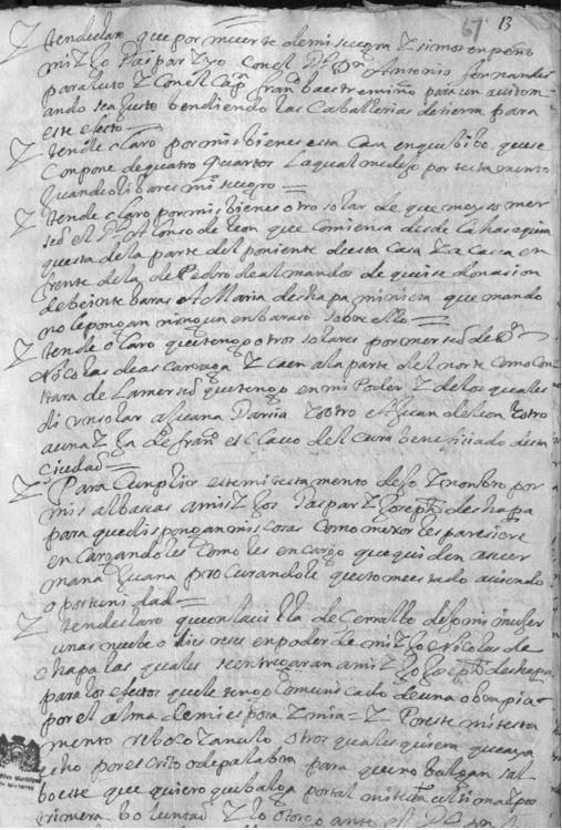 12. Iten. Declaro por mis bienes otro solar de que me hizo merced el Gobernador Alonso de Leon que comienza desde la acequia que esta desde la parte del poniente de esta casa y acaba enfrente de la de Pedro de Almandos de que hice donacion de veinte varas a Maria de Chapa mi nieta que mando no le pongan ningun embarazo sabre ello.